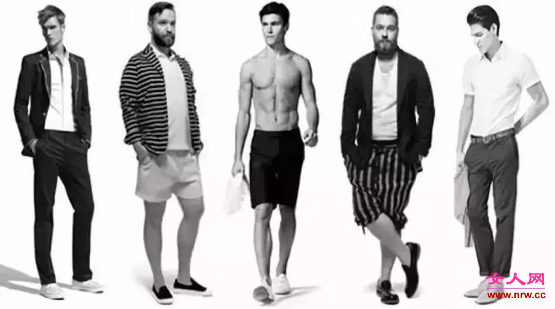 總的來說男士的身材可以分為五種:梯形(trapezoid)、長方形(rectangle)、倒三角(inverted triangle)、三角形(triangle)、橢圓形(oval)。