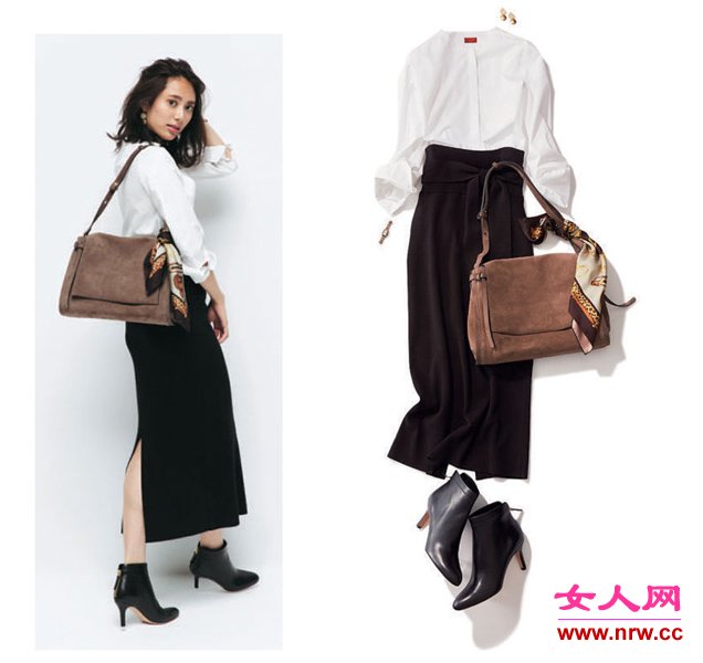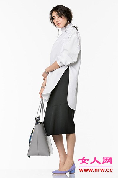 與白襯衫相配的黑裙子給人一種長而緊湊、高雅的印象。上下都以恰好的尺寸感漂亮地穿得合身的事點是點。