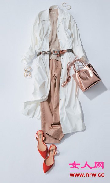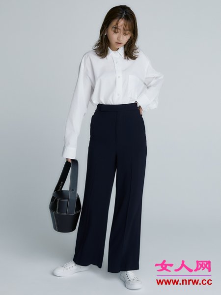 將白襯衫的扣子固定在上面,突出端正的氣氛。比起夾克衫,更希望能穿出柔軟輪廓的中心緊身寬褲,散發女人味兒。